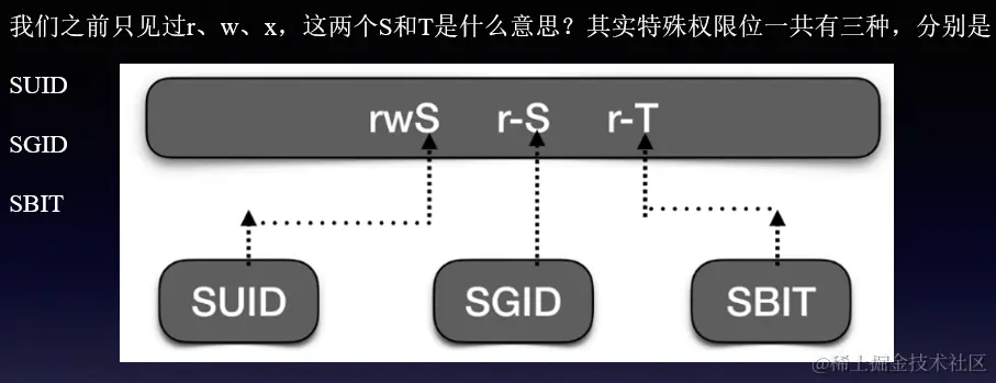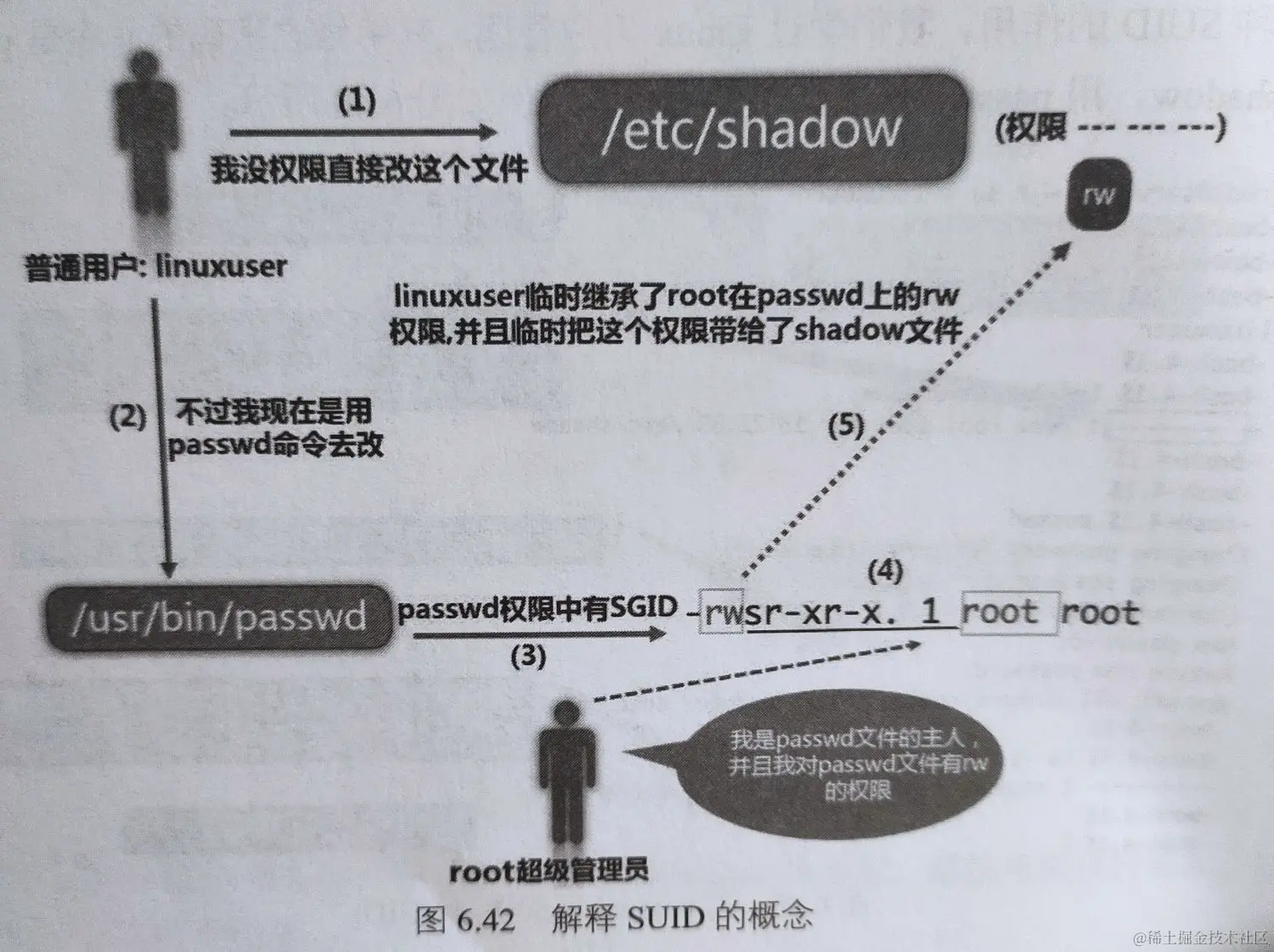 一个普通用户linuxuser是没有权限直接修改 /etc/shadow 文件的,因为这个文件的权限是 --- --- ---,而linuxuser修改自己密码时使用 passwd 命令,等于说 passwd是一个桥梁。passwd 这个命令也是一个文件,也就是 /usr/bin/passwd,并且这个文件的属主权限中有一位 SGID。有了这个 SGID 后,当普通用户 linuxuser 调用这个 passwd 命令时,linux系统就去找这个 passwd 文件的属主,发现 passwd 文件的属主是 root 管理员,并且 root 对这个 passwd 文件有 rw 权限。所以说,root 用户对passwd 文件有 读/写权限,于是Linux 操作系统让 linuxuser 用户继承了 读/写 权限,并可以临时用在 shadow 文件上,这样普通用户就通过passwd命令修改了 shadow 文件。SGID 就是一个继承属组的关系。