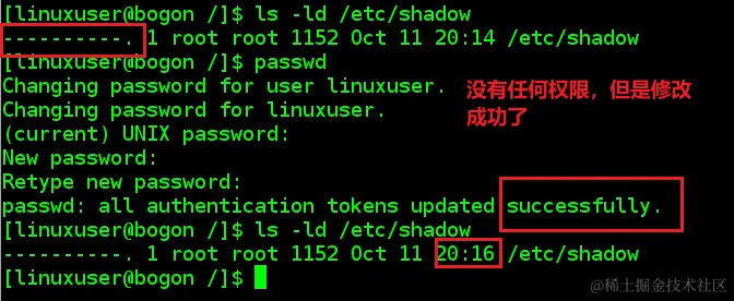 linuxuser是一个普通用户,没有任何权限,但是修改了密码,也就是修改了 shadow 文件。