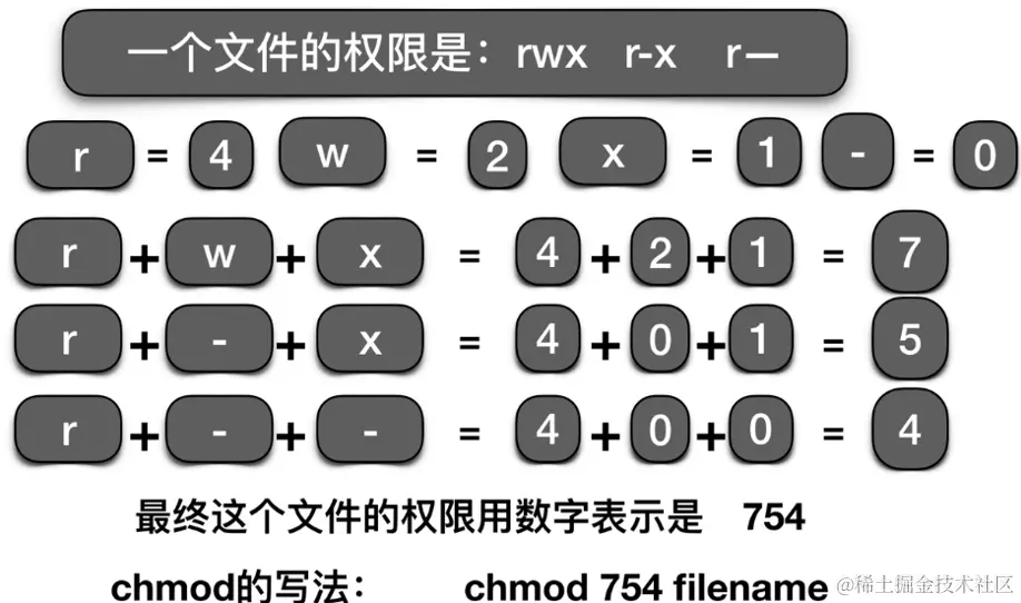 规定:r = 4,w = 2,x = 0,-=0(没有权限就是0),然后用加法进行计算。