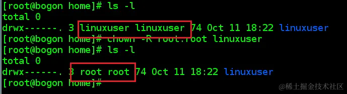 chown -R 属主:属组 用户文件夹 --chown命令配合-R可以一次性改变属主和属组。