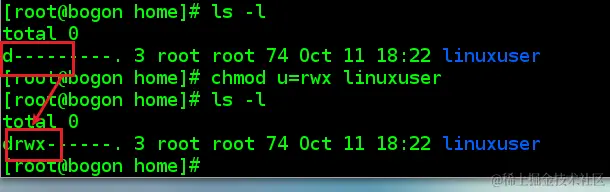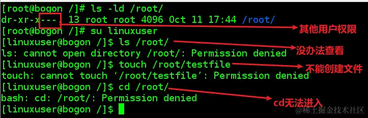 /root/ 文件夹的权限很严格,除了root用户外,其他的任何用户都没有任何权限。切换到 linuxuser 下测试,什么权限也没有(linuxuser 在这里就相当于是其他用户)。