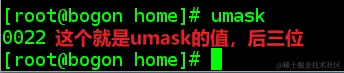 umask 的值是 0022,第一个0不用管先,在Linux操作系统中,有初始最大权限的概念,文件是 666,文件夹是 777,这就相当于锁定一个初始值。