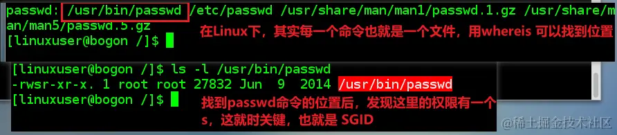 当找到passwd命令时,发现这个命令的属主权限中有一个是 s,这代表了普通用户linuxuser使用passwd命令时,系统看到passwd命令中属主属性有大写 S 后,表示这个命令的属主权限被linuxuser用户获得,也就是linuxuser用户获得文件 /etc/shadow 的root 的rwx权限。