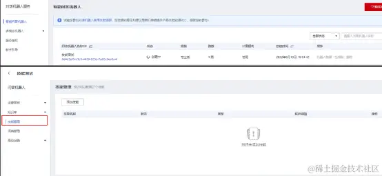 问答机器人创建成功后,返回对话机器人服务主页面,等待机器人创建成功后,点击“机器人名称”进入机器人,左侧的标签栏中会有一项技能管理。