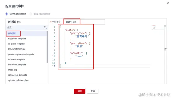 在测试事件输入框中填入:{"slots":{"poetryType":["五言绝句"],"poetryName":["秋思"],"acrostic":["true"]}},如下图所示: