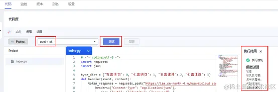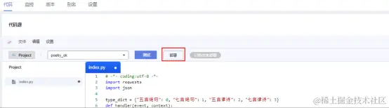 代码上传方式:在线编辑。将本地文件夹下poetry_demo.py文件中的代码复制粘贴进来。然后填入真实的账号名、用户名、密码。再点击“部署”。