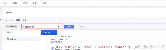 点击右上角的“请选择测试事件”下拉框中的“配置测试事件”按钮,如下图所示: