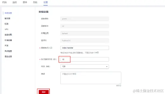 配置函数的超时时间,点击“设置”页签,然后将执行超时时间改为10,点击保存,如下图所示: