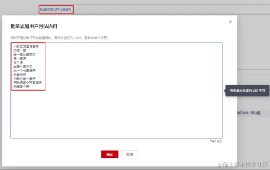 进入“poem”意图的“用户问法”,点击“用户问法语料”输入框下方的蓝色字体“批量添加用户问法语料”,复制下方的语料至弹出对话框,点击“确认”完成用户问法预料导入。