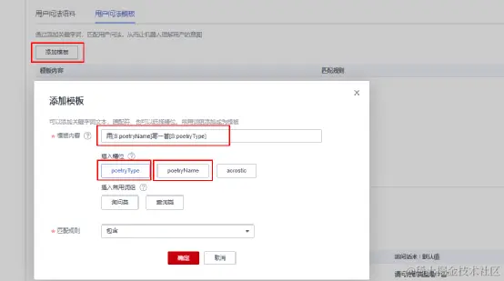 点击“添加模板”按钮。模板内容如下图所示,在相应位置点击下方槽位名称插入相应槽位。完成配置后用户即可使用模板的问法与机器人进行对话。