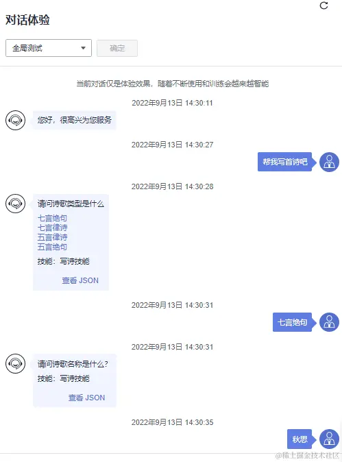 模型发布完成后,回到“技能管理”页面,点击右上角“对话体验”按钮(诗歌类型槽位已配置开启候选项,因此用户可通过点击响应类型进行自动回复)