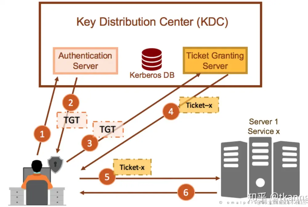 - Ticket Granting Service(TGS): 验证 TGT 与 Authenticator(上图中的用户身份就是他),为客户端提供Service Tickets服务许可票据。