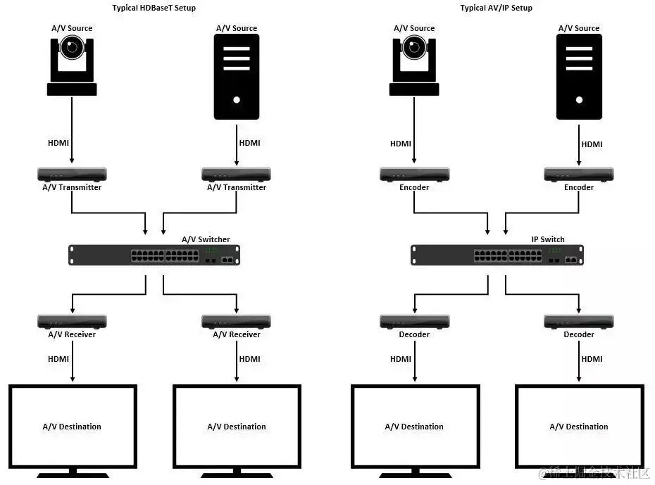 什么是AV over IP呢?与传统的AV系统不同,AV/IP是在标准IP网络上传输和切换视频和音频信号源。在两种AV方式中,主要的构架都差不多。在IP方式中,音视频信号发送器变被换成了编码器,音视频信号接收器被变成了解码器,音视频切换器成为了标准的“IP交换机”。
