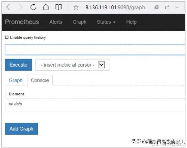 启动之后,可以通过Prometheus内置的Web页面进行查看,地址为服务器IP:9090,如图9-1所示。