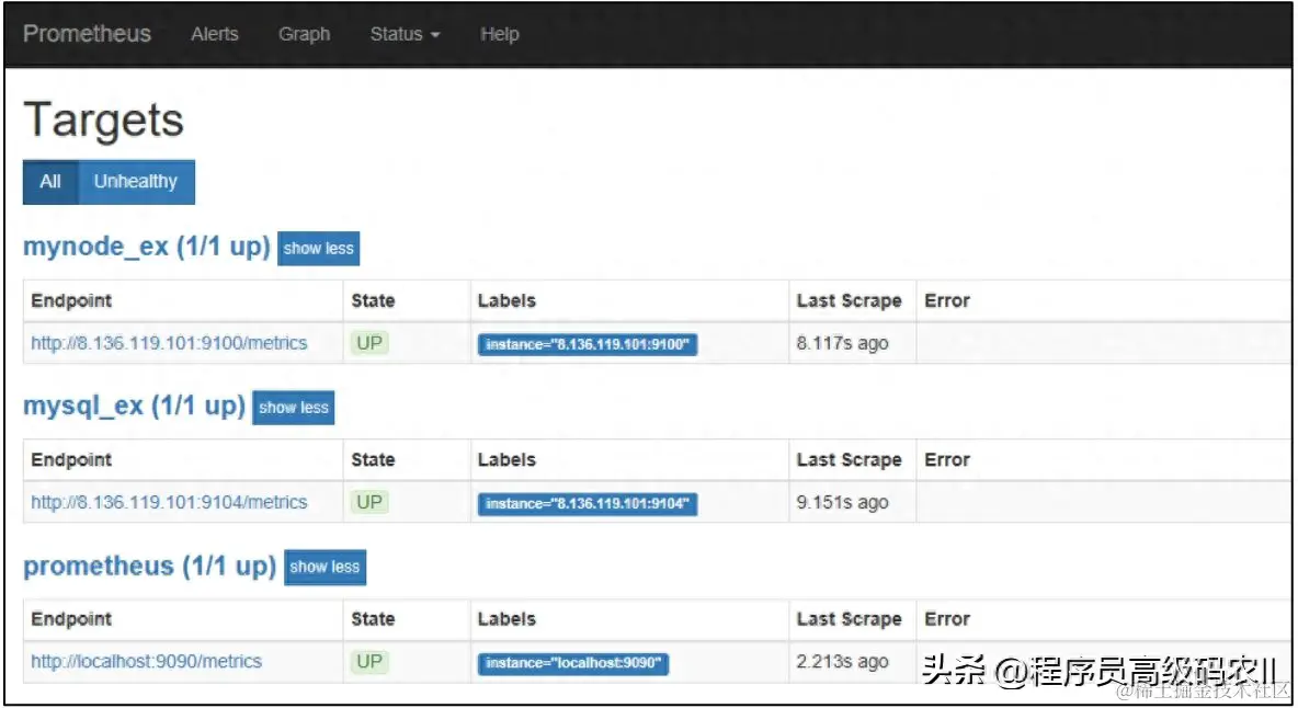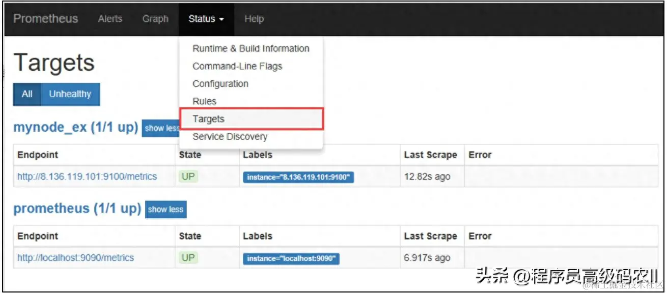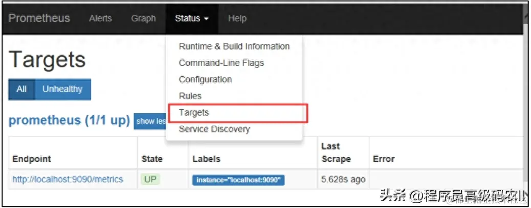 单击Status下拉框中的Targets按钮,可查看当前Prometheus监控了哪些服务器。目前Prometheus只监控了本机,如图9-3所示。