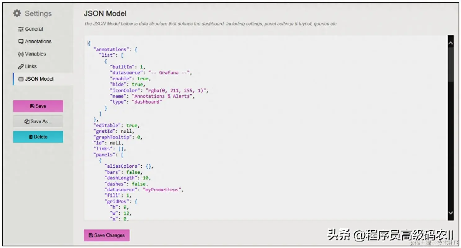配置完之后,单击右上角的Save dashboard按钮,在Grafana内部进行保存。也可以单击Settings按钮保存为JSON文件,以免Grafana崩溃而直接丢失图表配置。JSON文件的内容如图9-19所示。