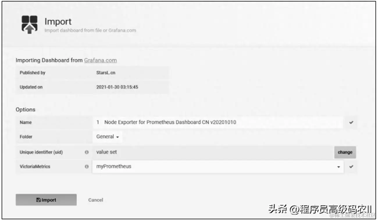 单击Load按钮之后,更改Import页面中的Name(即Dashboard的名称),以及VictoriaMetrics处的数据源,如图9-22所示。