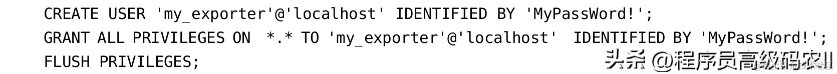 在MySQL控制台中添加用户名及角色权限。这里的mysqld_exporter插件与MySQL在同一台服务器上。mysqld_exporter插件通过新添加的用户名与MySQL 进 行 通 信 , 而 Prometheus 只 与 mysqld_exporter 插 件 进 行 通 信 ,Prometheus与MySQL并不直接关联。