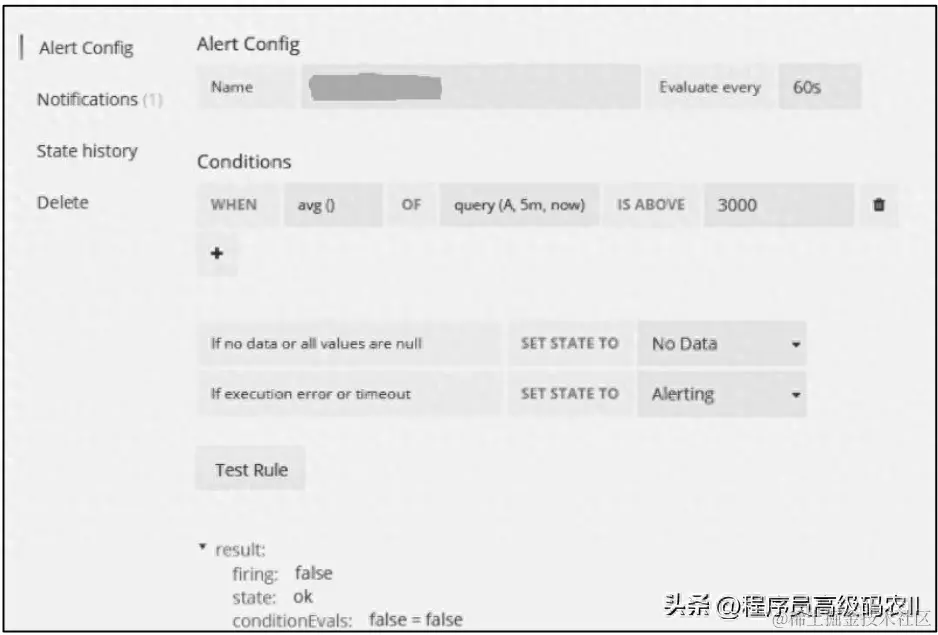 Test Rule尤其重要。这里可以用Java接收返回的JSON,也可以用来测试当前预警是否成功。当state为ok时,表示该监控没有问题。当state为Alerting时,表示该监控有问题,需要发送邮件。alert表示当数据达到发送监控要求时,哪怕目前数值持续性达到发送监控要求,也只会发送一封邮件。但是若在发送邮件之后,该数据又达到ok范围内,则Grafana会发送以