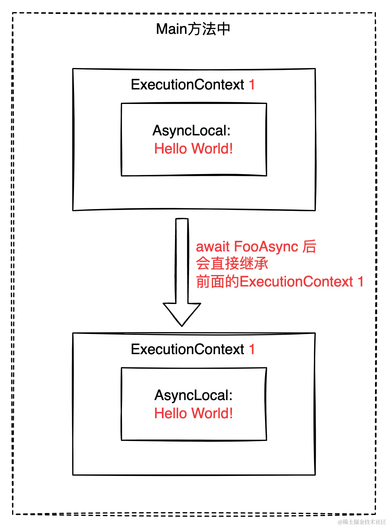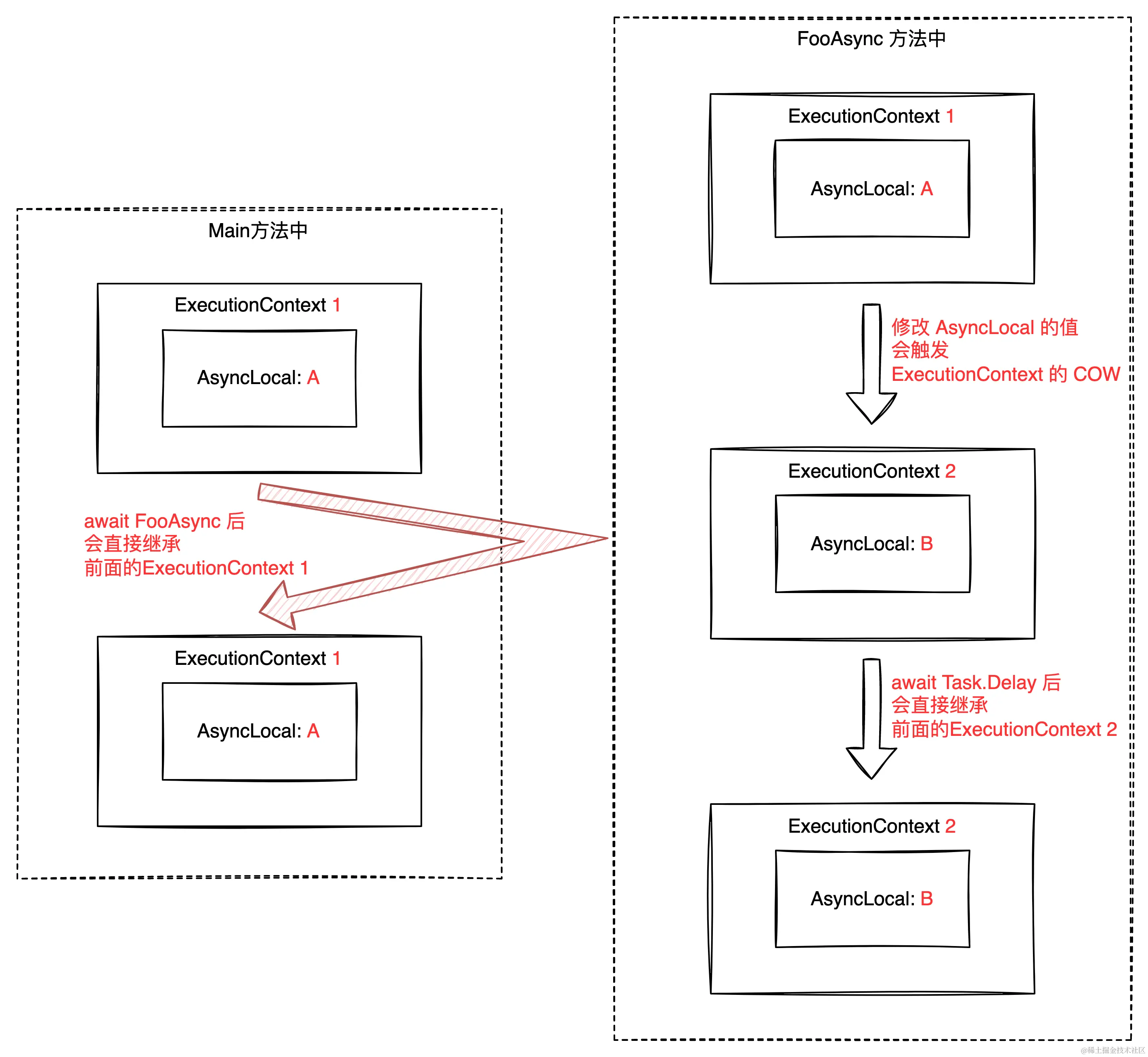 原因是 ExecutionContext 被设计成了一个不可变的对象,当我们在 FooAsync 方法中修改了 AsyncLocal 的值,实际上是创建了一个新的 ExecutionContext,原来其他的 AsyncLocal 的值被值拷贝到了新的 ExecutionContext 中,新的 AsyncLocal 的值只会写入到新的 ExecutionContext 中,而原来的 ExecutionContext 及其关联的 AsyncLocal 仍然保持不变。