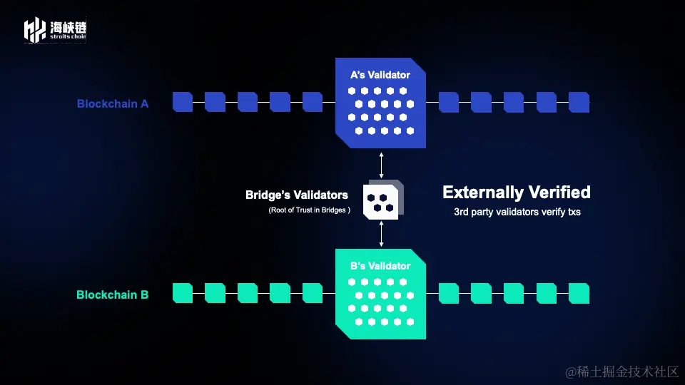 外部验证协议是指使用外部验证器集合来在链之间传递数据的协议。通常的做法是引入一组外部的验证者来负责验证跨链信息,用户必须相信这些验证者是可信的,验证者内部可能有某种机制来达成共识。