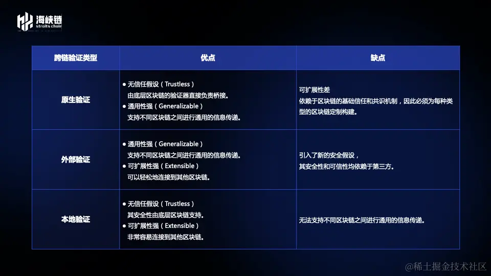 通过对比三种跨链验证发现,原生验证具有无信任假设和支持跨链通用信息传递的优点,理论上只要源链和目标链不发生重组,跨链信息传递就是安全的,但其可扩展性差。