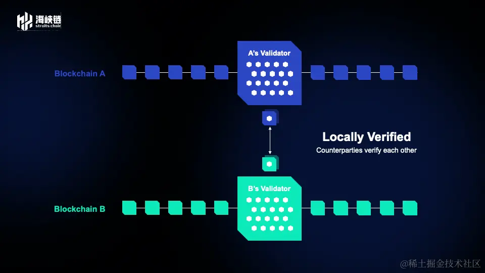 在本地验证的系统中,利用底层区块链的验证者集合进行跨链交换。与两个链上的整个验证者集合都验证一笔交易不同,两个验证者(分别代表己方链)会验证对方链上的交易对手。