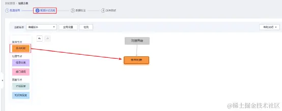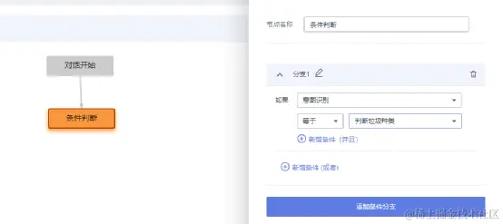 从左侧节点栏拖拽一个“条件判断”节点到“对话开始”节点下方,并连接起来两个点。