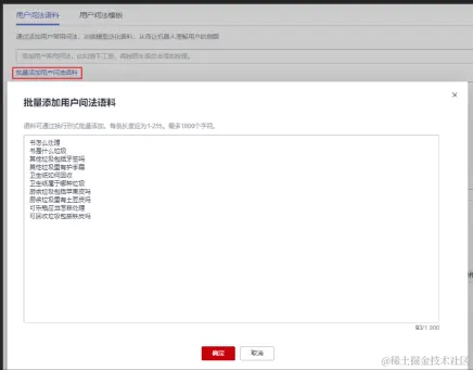 进入“判断垃圾种类”意图的“用户问法”,点击“用户问法语料”输入框下方的蓝色字体“批量添加用户问法语料”,复制下方的语料至弹出对话框,点击“确认”完成用户问法预料导入。