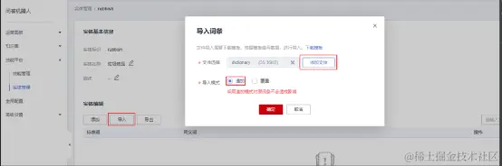 点击页面上的“导入”按钮,然后点击“添加文件”按钮,上传本地文件夹下的rubbish_dict.txt文件,导入模式选“追加”,最后点击“确定”按钮,即可完成垃圾物品词典词条导入。如下图所示: