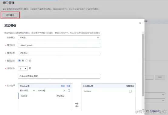 往下滑动页面,找到“槽位管理”页面,创建槽位:rubbish(垃圾类别),然后点击“添加槽位”按钮,按照如下指导,添加rubbish_goods槽位: