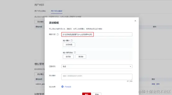 点击“添加模板”按钮。模板内容如下图所示,在相应位置点击下方槽位名称插入相应槽位。完成配置后用户即可使用模板的问法与机器人进行对话。