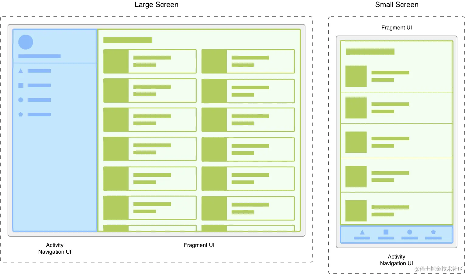 同一屏幕的采用不同屏幕尺寸的两个版本。在左侧,大屏幕包含一个由 Activity 控制的抽屉式导航栏和一个由 Fragment 控制的网格列表。在右侧,小屏幕包含一个由 Activity 控制的底部导航栏和一个由 Fragment 控制的线性列表。