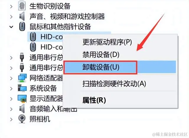 2.在【鼠标和其他指针设备】下找到您的鼠标,右键单击它,选择【卸载设备】;