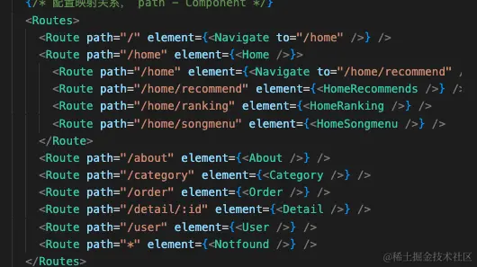配置对象的写法与编写Route元素的方式类似,只是将对应的path以及element属性换了一种编写方式,改写成为js对象的方式。
