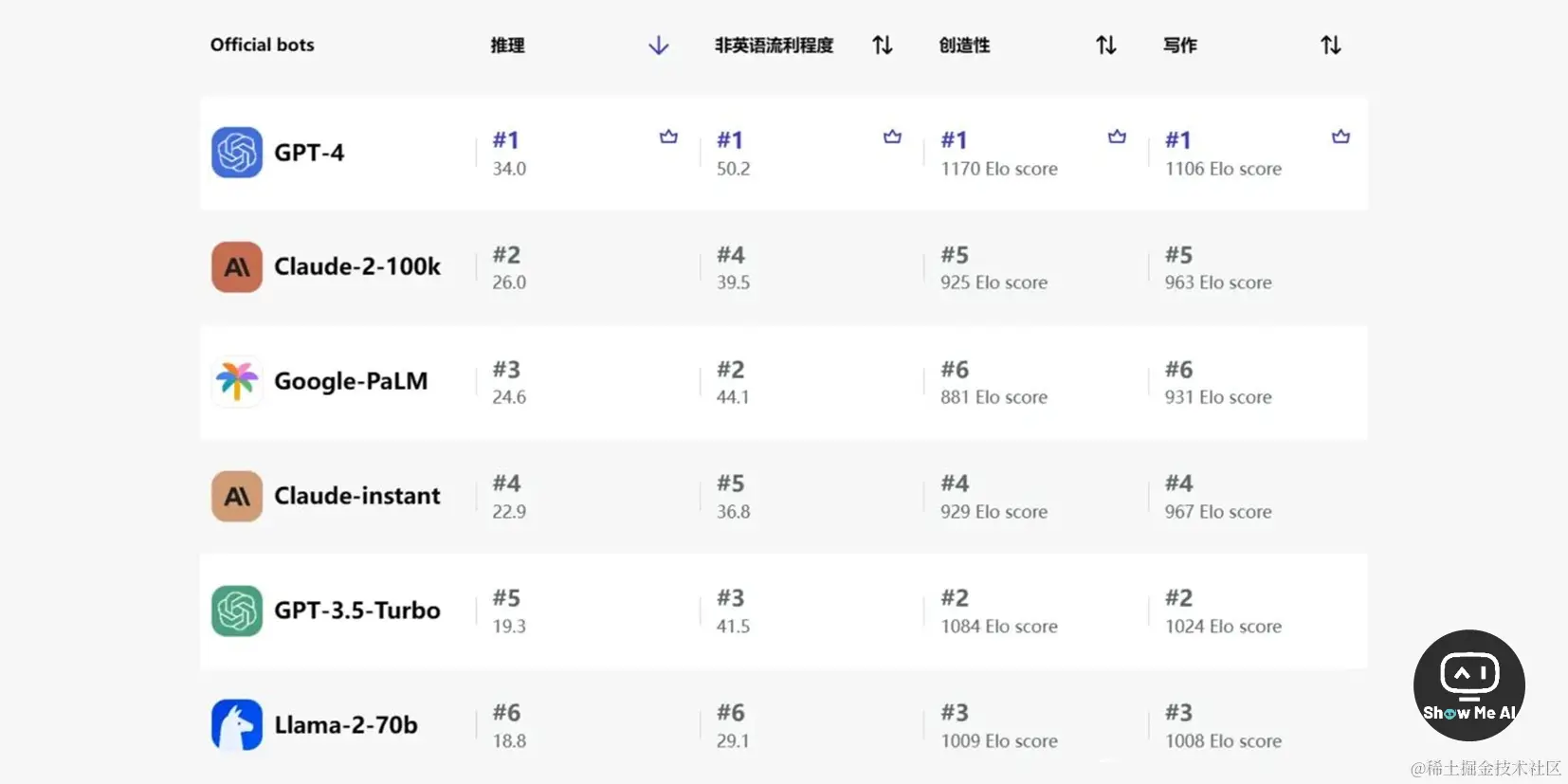 GPT-4 拿到了所有第1名,一如既往是「别人家的孩子」。不过,Google-PaLM 对非英语地支持能力排在第2名,Llama-2-70b 在创造性和写作测评中获得第3名,倒是让人耳目一新!值得多做一些模型应用尝试和摸索。测评原理可以访问上方 Poe 链接查看博文~
