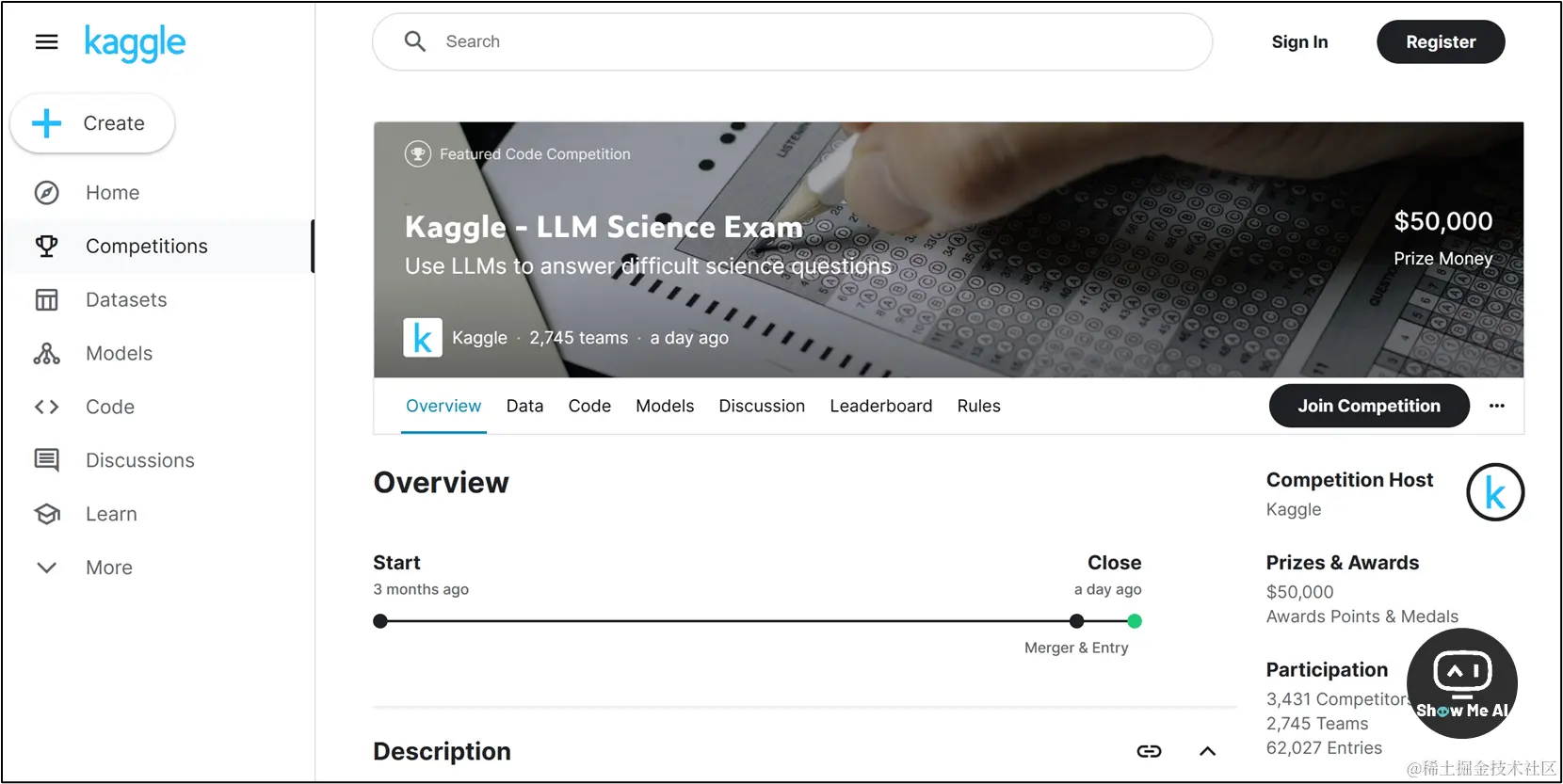 Kaggle 作为全球知名的数据科学比赛平台,也参与到了大模型浪潮当中,陆续上线 LLM 相关的比赛和主题分享。