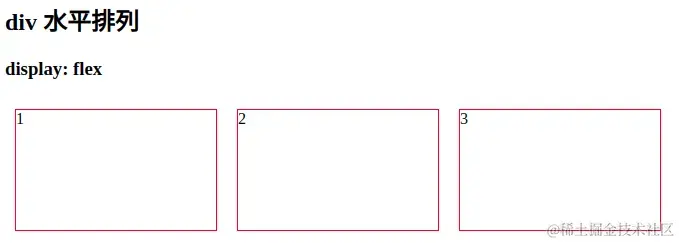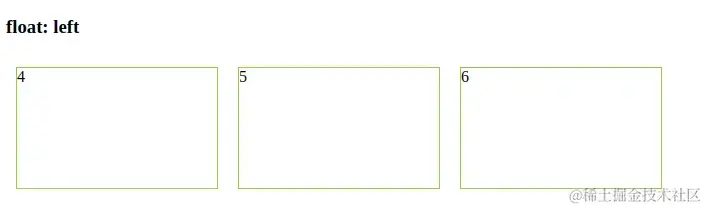 浮动的方式实现水平布局,这种布局方式已经很少用了。(注意设置浮动的元素会影响下面元素的正常排列,设置 clear: both; 即可解决)