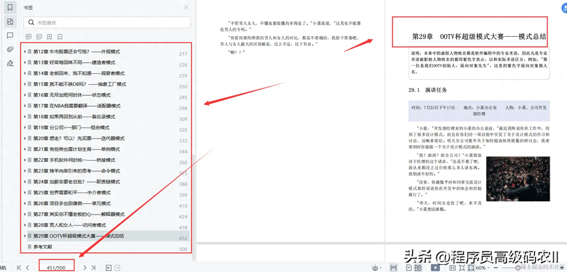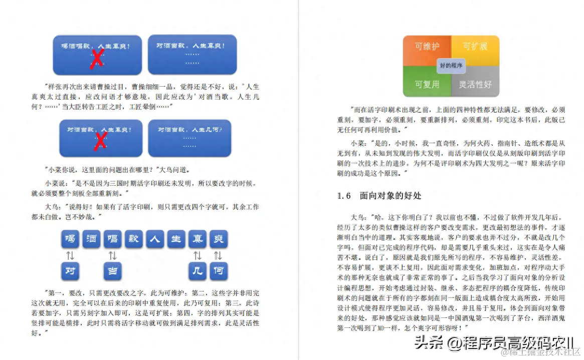 第四部分(第29章)是对设计模式的总结,利用小菜梦到的超级模式大赛的场景,把所有的面向对象和模式概念都拟人化来趣味性地总结设计模式之间的异同和关键点。