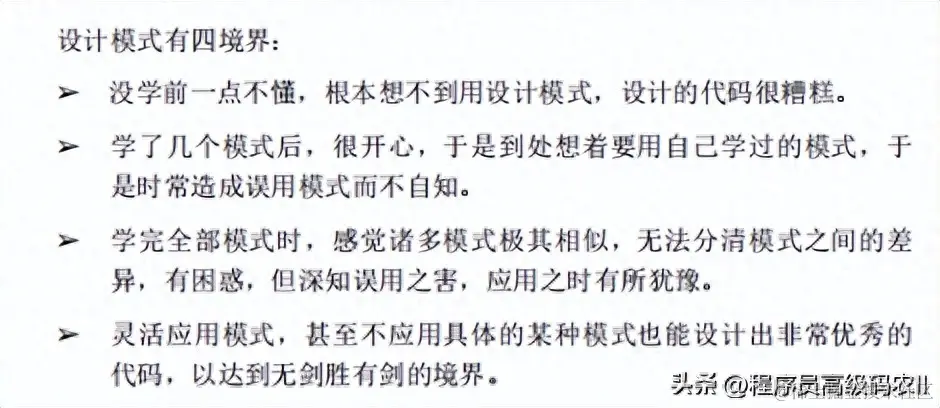 所以,掌握气宗就掌握了编程命脉,然而学习设计模式有四大境界: