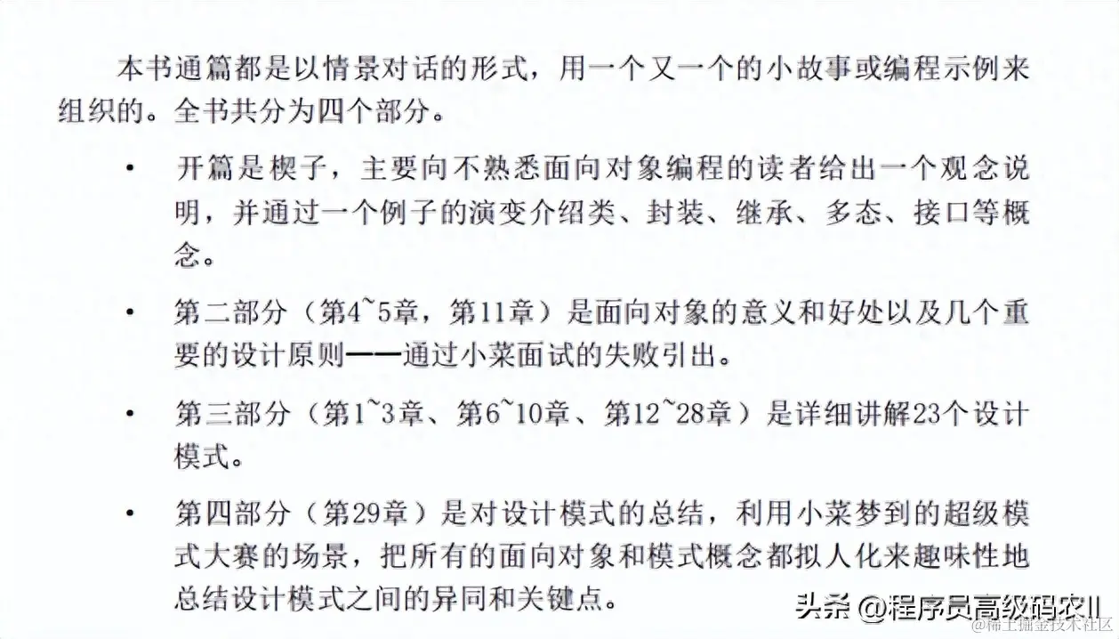 第二部分(第4~5章,第11章)是面向对象的意义和好处以及几个重要的设计原则——通过小菜面试的失败引出。