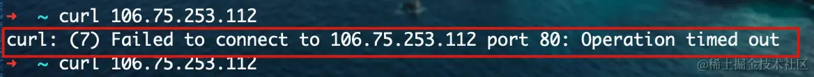 发现直接在本地请求 LB01 的外网 IP 地址时,一直处于等待状态,最终报错:Operation timed out。
