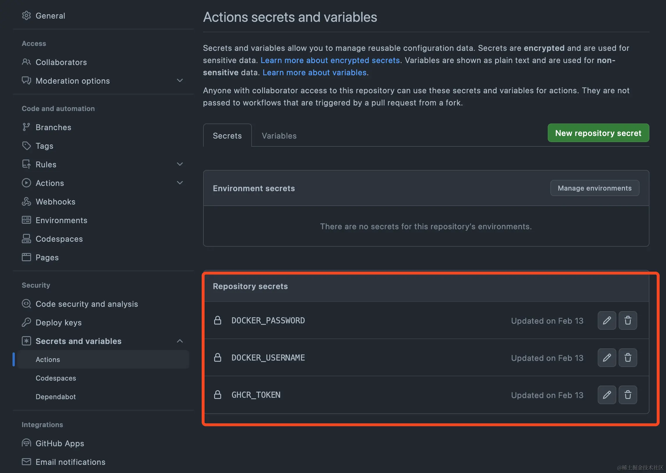 配置 Secret:为了安全地推送镜像到 Docker Hub 和 ghcr.io,你需要在 GitHub 仓库的 "Secrets" 部分配置相应的认证信息。通常,这包括你的 Docker Hub 用户名、密码,以及 ghcr.io 的 token。例如: