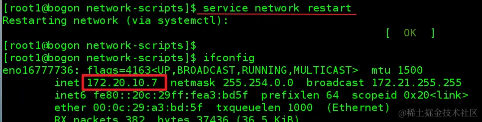 service network restart重启后使用 ifconfig 可以看到获得的 IP 地址。