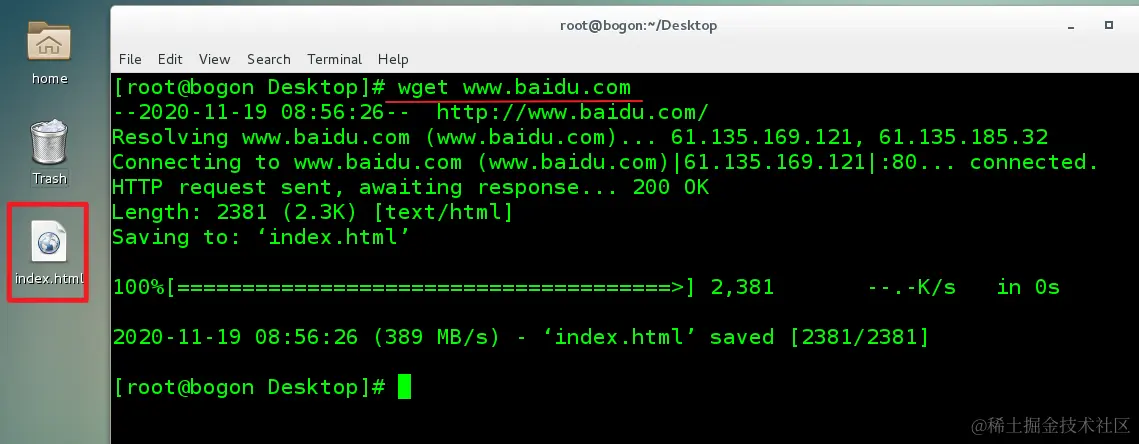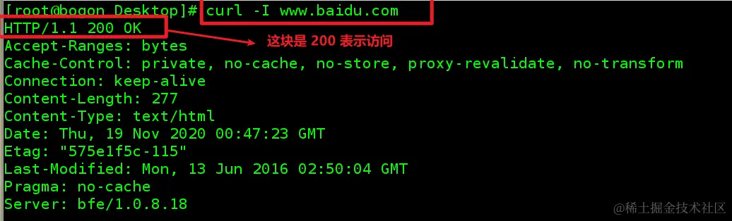 这个命令可以被看做命令行下的简易浏览器,相当于使用浏览器来访问百度的首页,http返回码,200就代表访问成功了