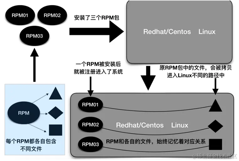 RPM 包特点:是一种文件,只不过是一种打包文件。每个包中都包含了不同的文件(可执行文件,普通文件等);一旦 RPM 包安装到 Linux 系统中,就等于注册进去了,Linux 会记住所有的安装上的RPM包;假设一个 RPM 包中包含 A,B 两个文件,当 RPM 包被安装后,RPM 包和 A,B 两个文件会始终保持这一种连带关系。也就是说,无论何时都可以查到 A,B 两个文件来自 RPM 包。