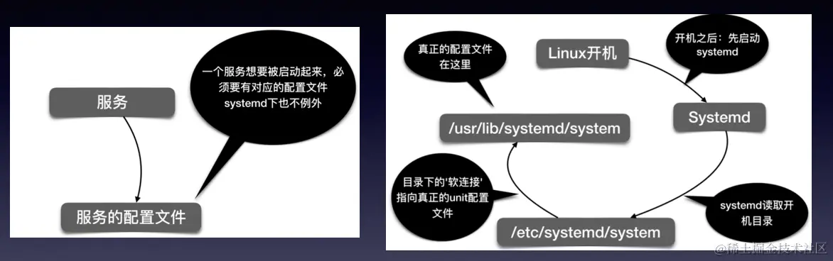 systemd 下的服务配置文件都保存在 /usr/lib/systemd/system 下,然而 Linux 本身启动只关注另一个目录:/etc/systemd/system,所以,要想启动需要将配置文件放于两个文件夹中,两个文件不必要各放一个,创建一个软链接即可。