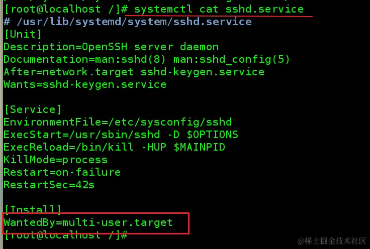 sshd.service 是有的,只不过存在于一层子目录下面:multi-usr.target.wants,说明 sshd.service 包含在 multi-user 这个 target 组中。开机启动 multi-user 组顺带就会把 sshd.service 也给启动了。在定义一个 systemd Unit 时,它的配置文件中会指明这个 Unit 属于那个 target。