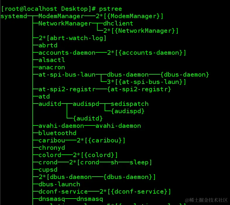 pstree -- 把 Linux 下面所有进程按照一个树形结构显示出来,进程比喻成 树枝