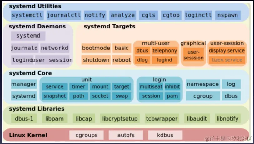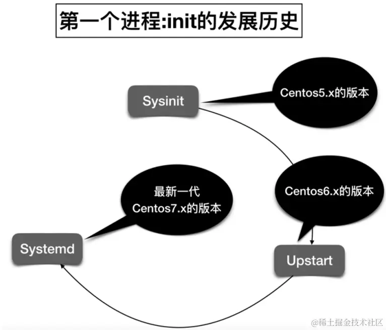 init 是一个统称,作为第一个启动的程序,这个 init 程序从 Linux 诞生开始就在不断地更新,目前新一代的 init 系统叫做 systemd。